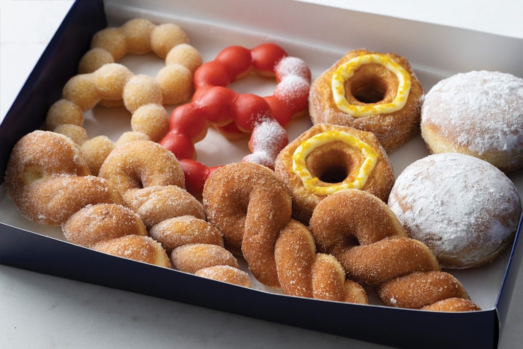 A selection of our handcrafted donuts including our Sugar Twisted Donut, King Cream Donut, Croissant Donut, Sugar Mochi Donut, and Strawberry Mochi Donut.