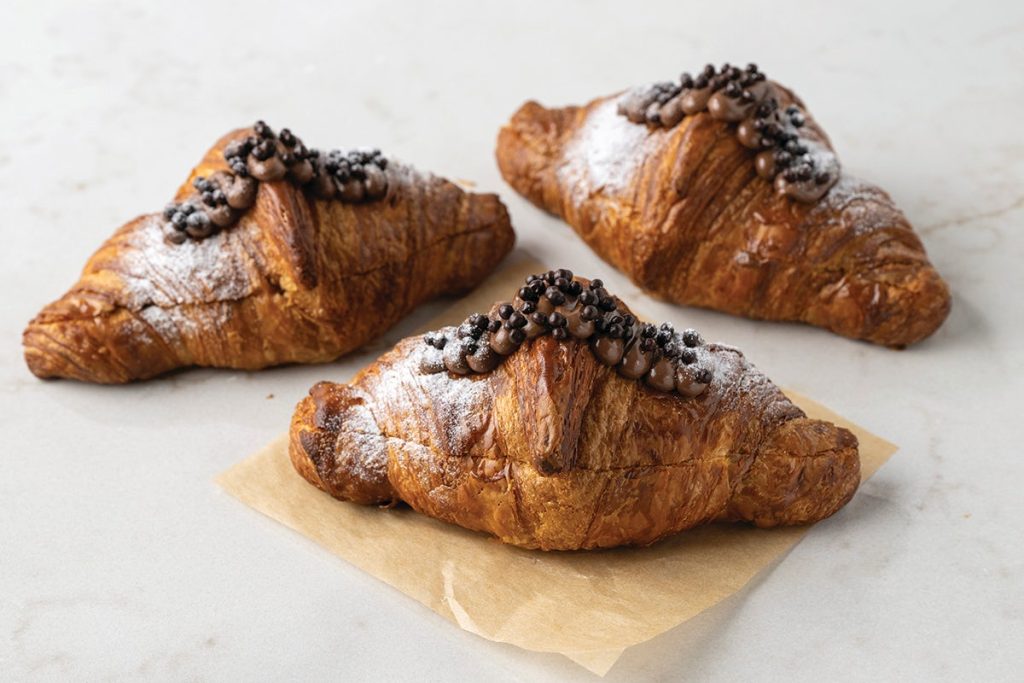 Menu / Seasonal Sweets / Croissant filled with Nutella®Croissant filled with Nutella® Flaky croissant filled and topped with Nutella® and chocolate crisp pearls. Contains: Egg, Hazelnut, Milk, Soy, Wheat 450 Calories per serving