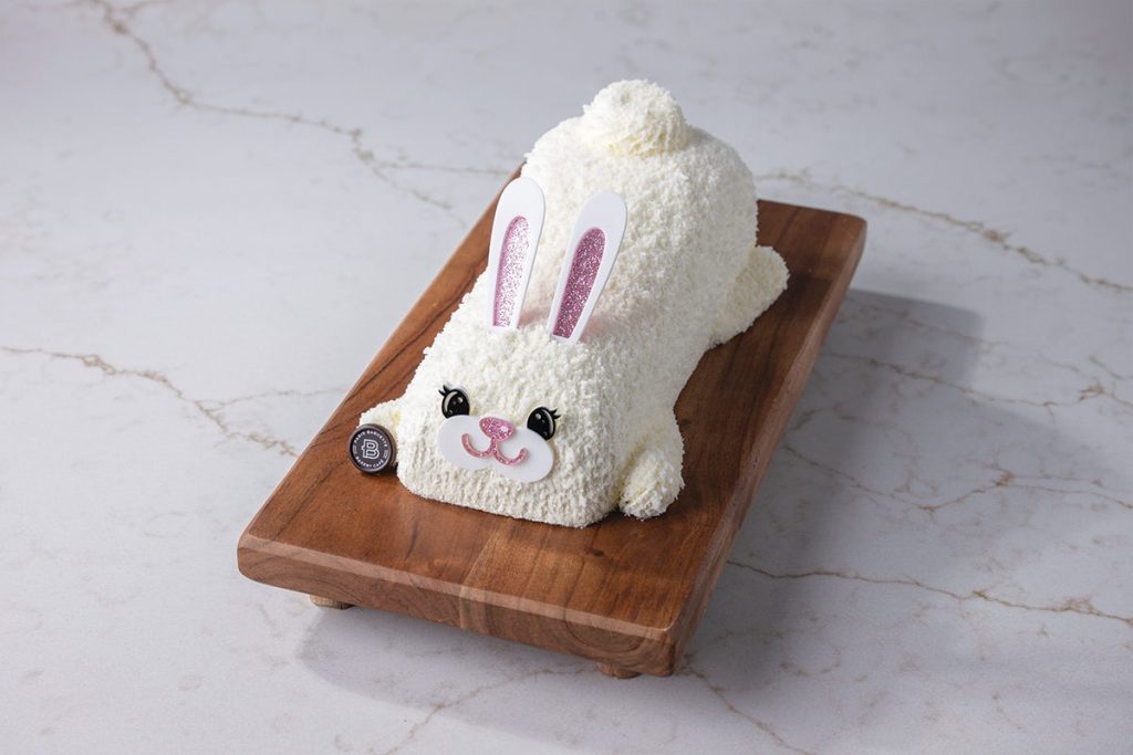 Bunny-shaped French genoise cake freshly rolled with raspberry jam and vanilla pastry cream, finished with vanilla icing and shredded coconut.
