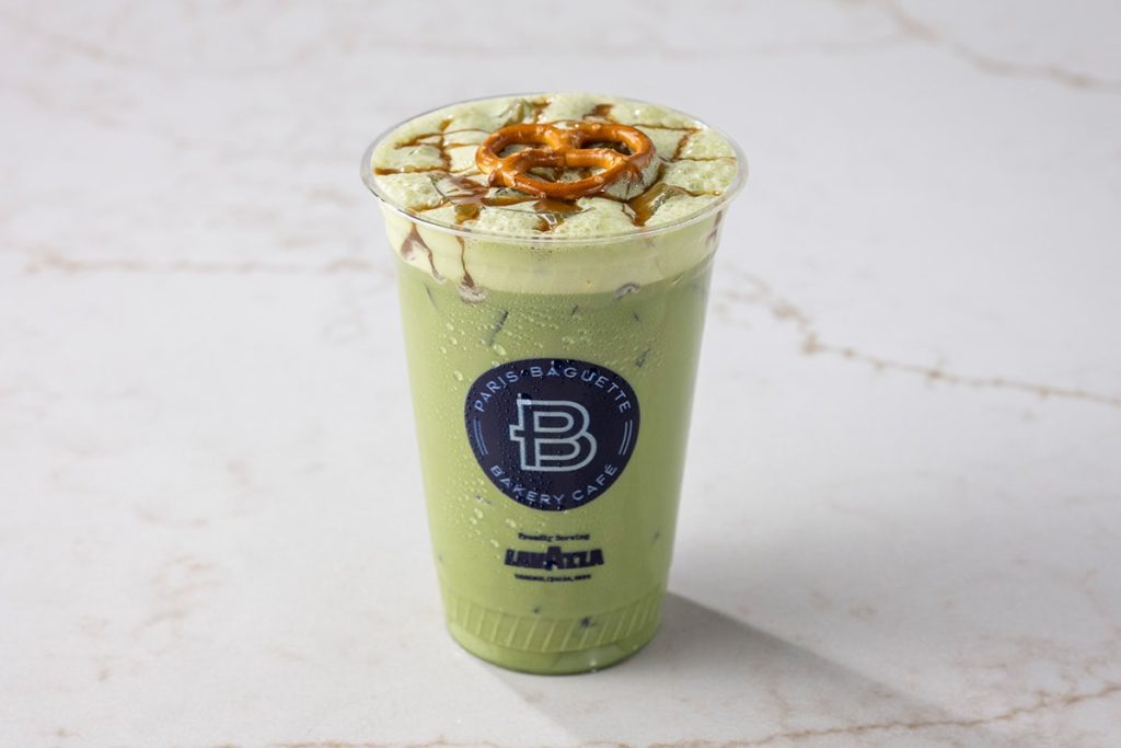Menu / Iced Beverages / Iced Salted Caramel Pretzel Matcha LatteIced Salted Caramel Pretzel Matcha Latte Ceremonial grade matcha swirled with salted caramel sauce and milk of choice over ice, drizzled with more caramel and topped with a pretzel. Contains: Milk, Wheat 390 Calories per serving