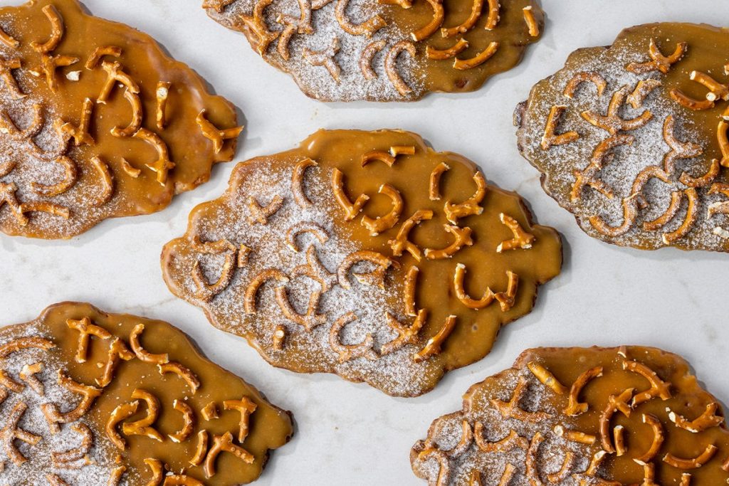 Menu / Sweets & Pastries / Salted Caramel Pretzel Croissant CrispSalted Caramel Pretzel Croissant Crisp Croissant crisp pressed to perfection, covered in salted caramel and topped with pretzel pieces. Contains: Egg, Milk, Wheat 210 Calories per serving